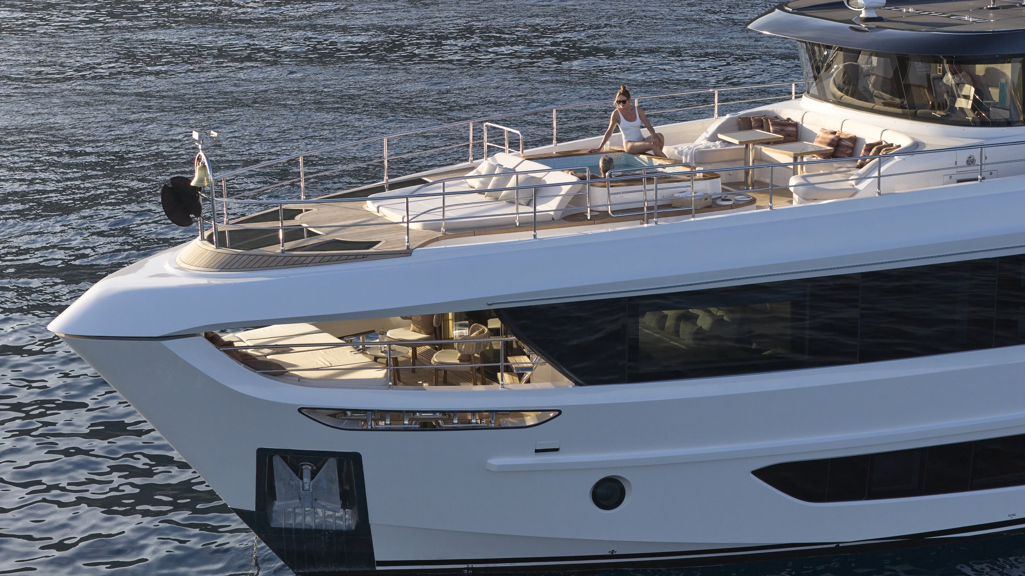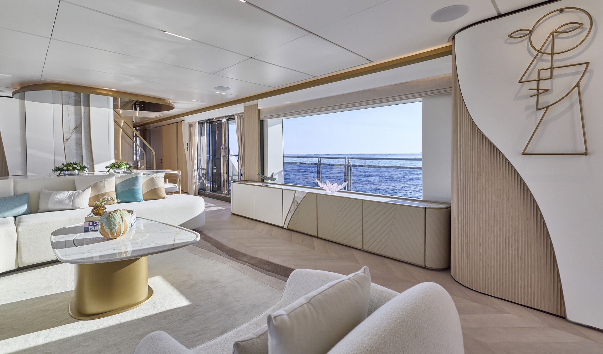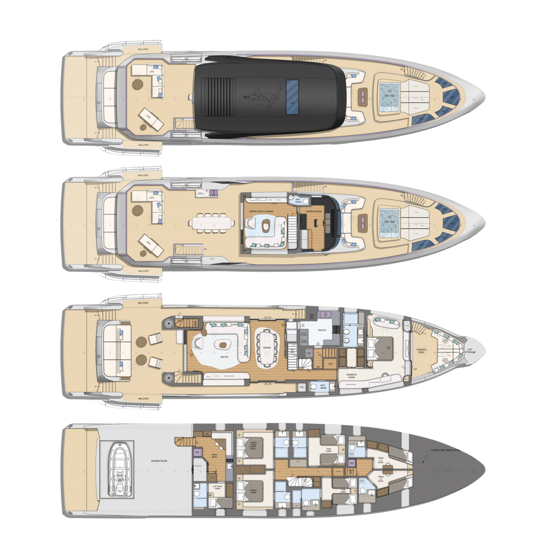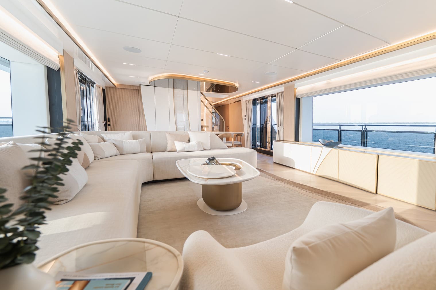 Engineered for optimal performance, it blends fuel efficiency with raw power for smooth cruising, whether in the Mediterranean or Caribbean. With a 20% increase in entertainment space, every deck is designed for social gatherings, while the interiors masterfully balance form and function for unparalleled comfort. Bathed in natural light through expansive glass skylights, the yacht’s wide, open spaces create a seamless indoor-outdoor connection, enhancing its airy, open feel.