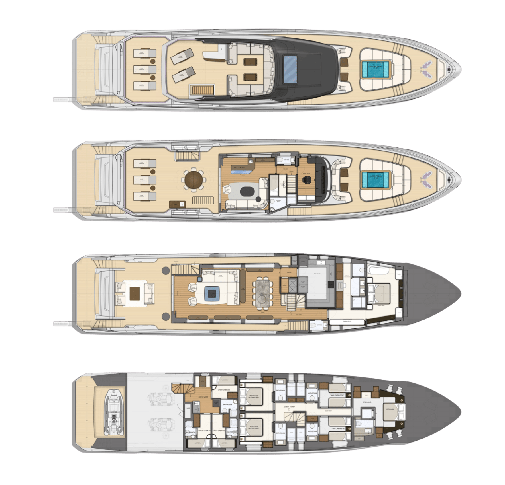 With a 12-guest capacity and accommodations for 6 crew, the Majesty 112 is built for entertaining in style. Vast open decks provide multiple lounging and dining areas, creating the perfect setting for alfresco gatherings, while the yacht’s spacious salon, lined with panoramic windows, floods the interior with natural light. The carefully curated materials and sophisticated furnishings reflect a timeless elegance, making the Majesty 112 feel both inviting and grand.