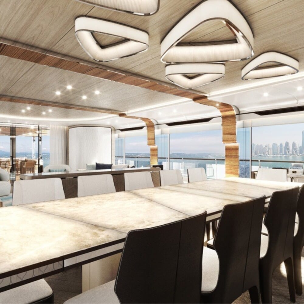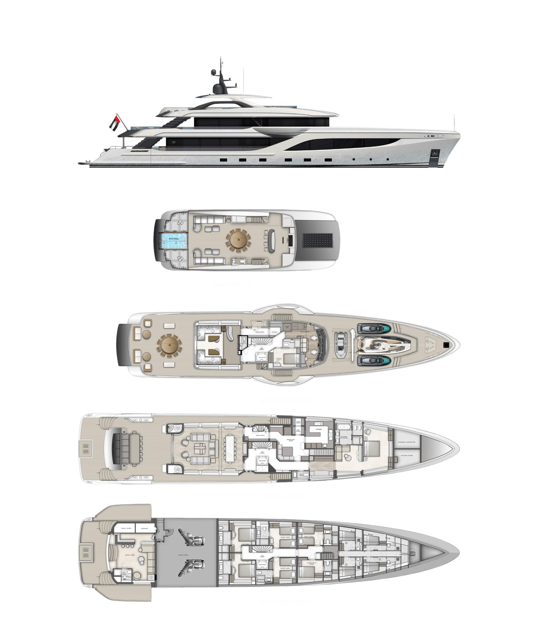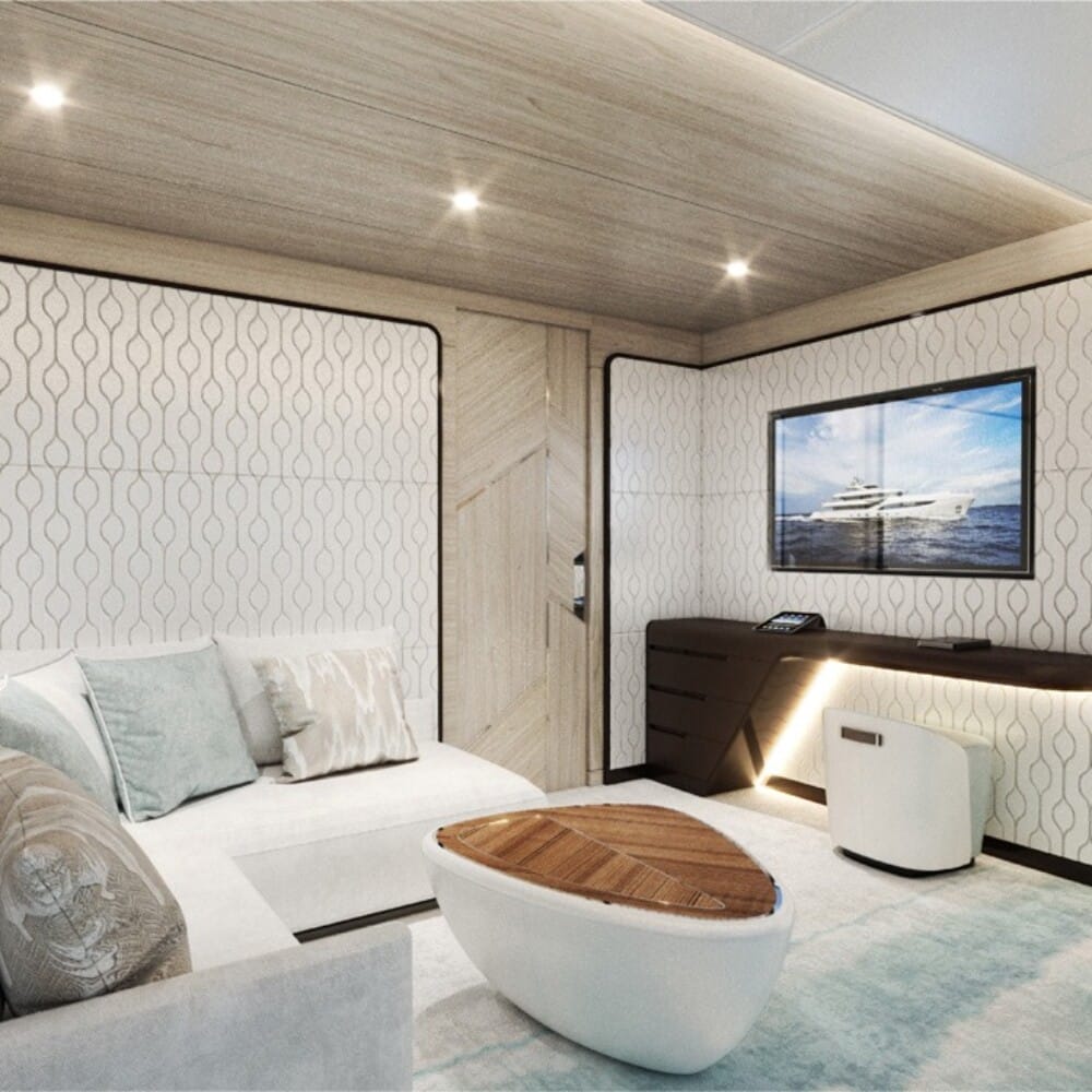 Her opulent exteriors feature an incredibly expansive sun deck, infinity pool, a hybrid beach club, fold-down balconies, and a swim platform providing guests unprecedented ease of access to the water. Her smart layout can accommodate up to 12 guests across its seven lavish staterooms, and can also host a crew of up to nine members with five large crew cabins and private captain’s accommodation.
