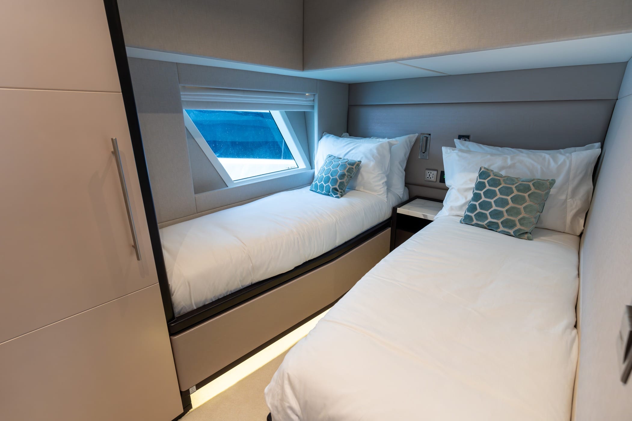 The elegance of her design continues into the sleeping quarters, with the owner’s cabin being situated mid ship allowing large windows to bring the feel of light and space to the lower deck. The Majesty 62 features four beautifully designed guest cabins that ensure privacy and comfort for extended stays on the water. Generous storage and crew accommodations make it a practical yet luxurious choice for family cruising or entertaining guests.