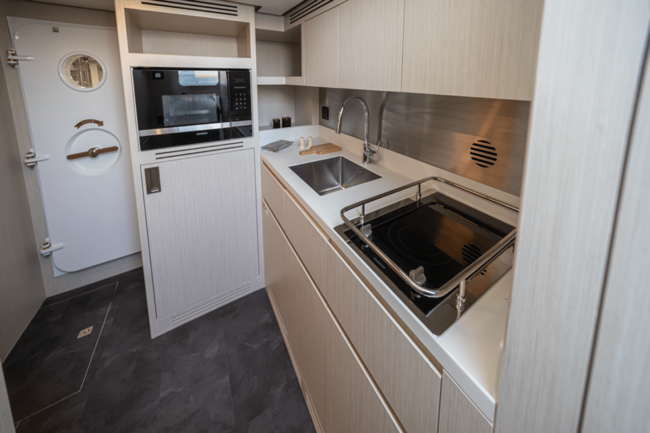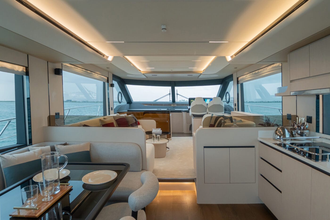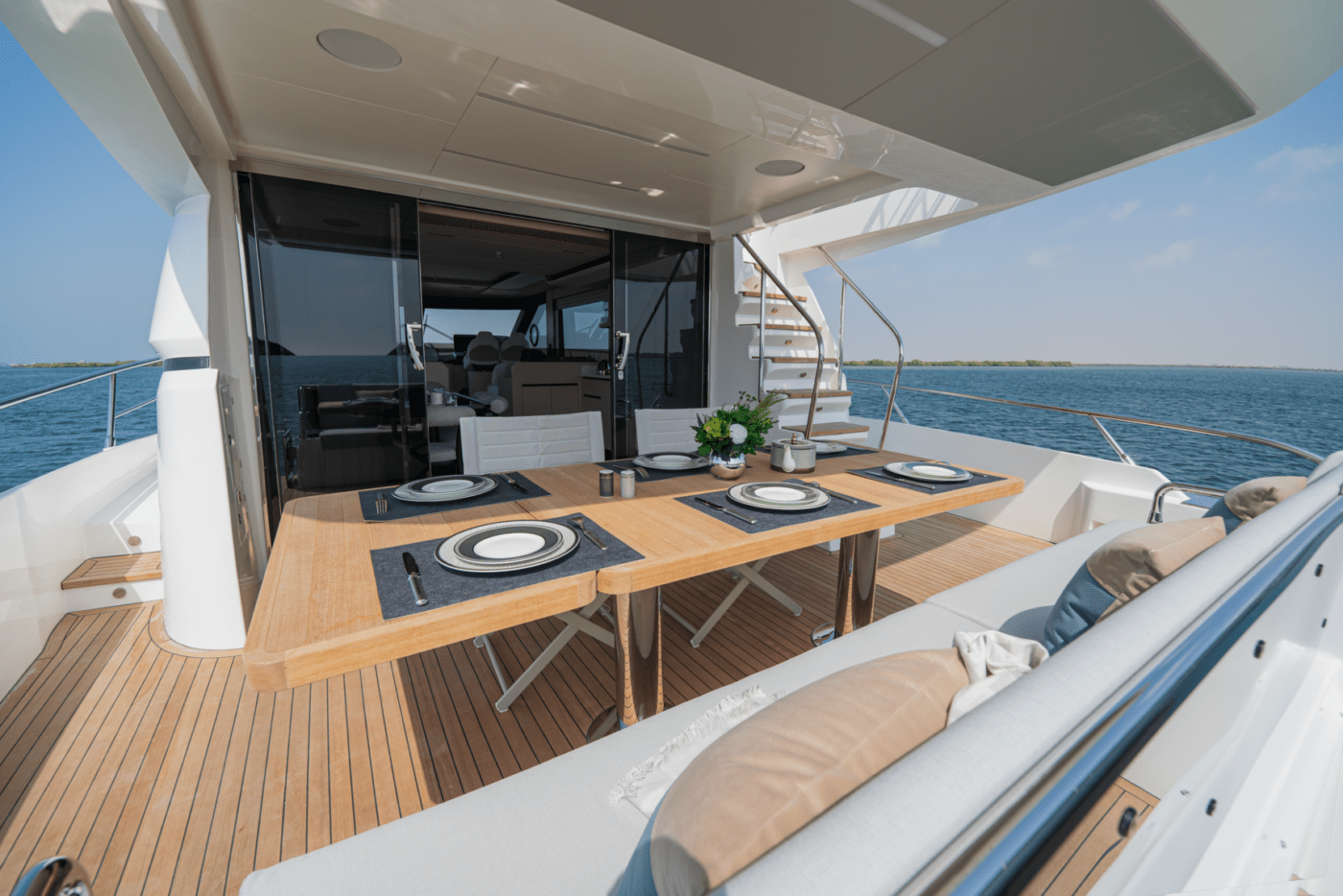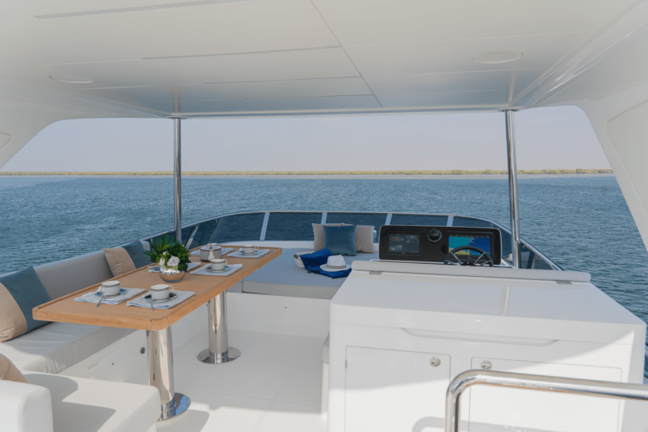 Expansive windows flood the interior with natural light, while premium materials and meticulous craftsmanship create a modern, sophisticated ambiance. The yacht’s thoughtfully designed decks provide multiple areas for relaxation, from alfresco dining areas to sun-drenched lounging on the spacious flybridge.